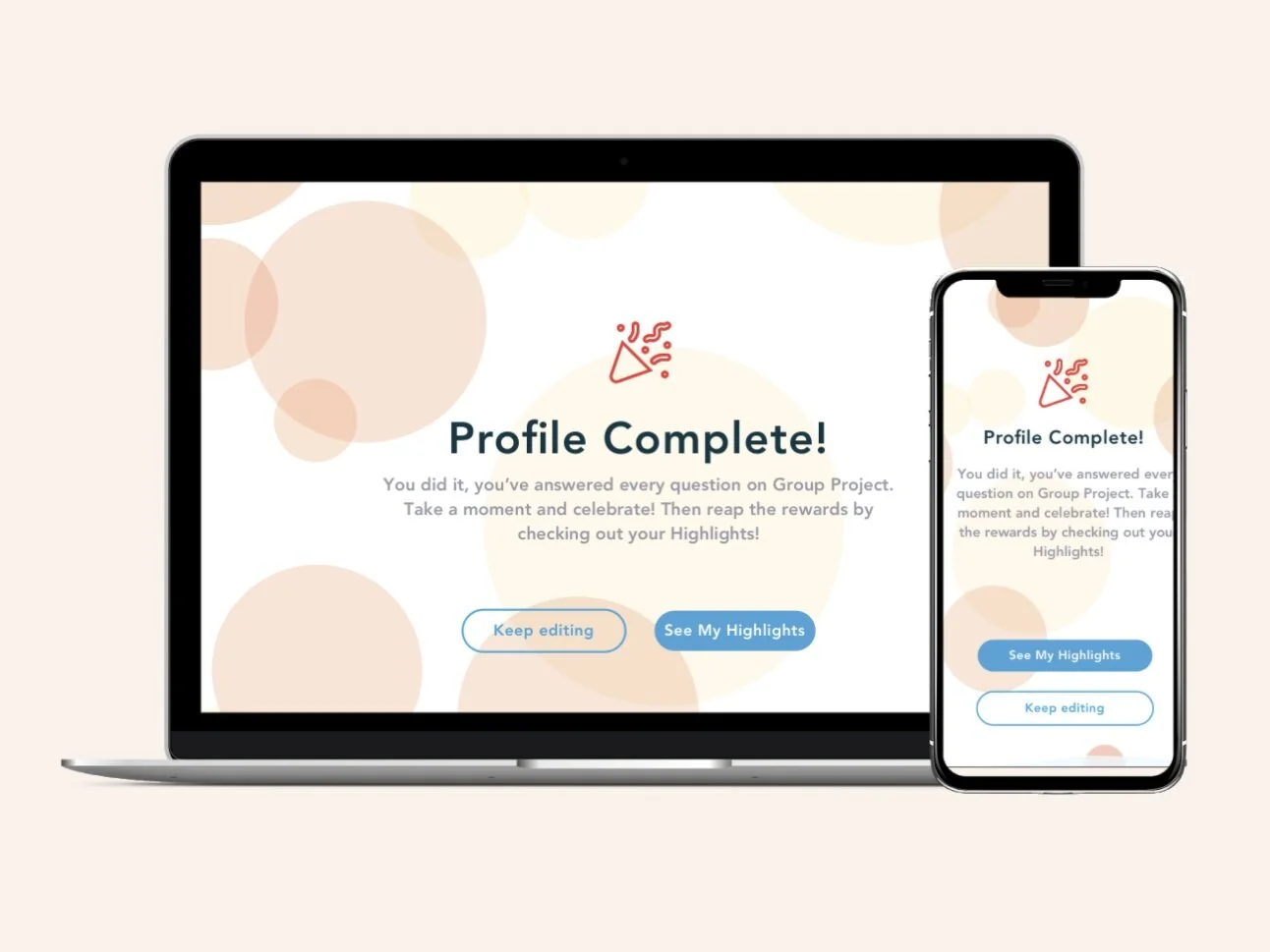 Wireframes of our micro-interactions, designed to celebrate profile completion.